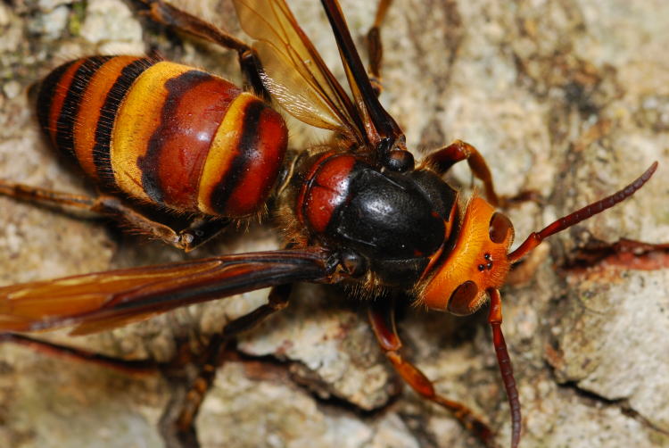 ・頭部のあごの色が茶色で、腹部がカラフルできれいなスズメバチ。