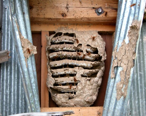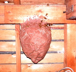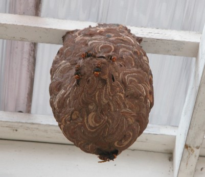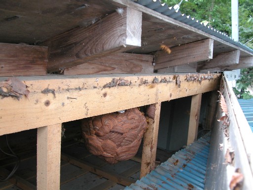 家のすぐ近くでは、なんと言っても屋根の軒下が目立ちます。これはキイロスズメバチやコガタスズメバチの巣です。