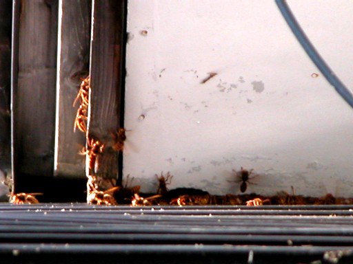 壁の中へ出入りをするキイロスズメバチ